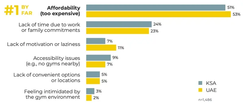 - Cost is the top hurdle for non-members: 51% in Saudi Arabia and 53% in the UAE believe gym memberships are too expensive.