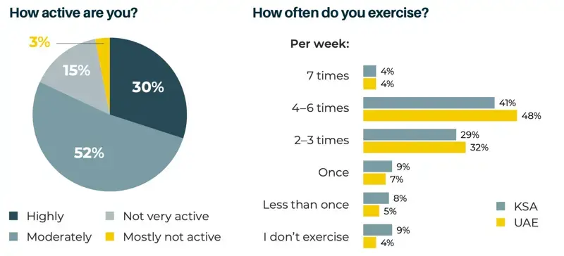 However, a striking 92% indicated that becoming healthier is a major aspiration. In contrast, this aspiration was shared by only 76% of people in the UK (PureGym, 2024) and 75% in the USA (Life Time, 2024), representing a difference of 16 and 17 percentage points respectively. Furthermore, 65% of people in the UK felt they weren’t looking after their health as much as they should, double the rate from our region, suggesting a strong push towards a healthier lifestyle likely bolstered by government efforts such as the Dubai Fitness Challenge (DFC, 2024) and Saudi Vision 2030 (Vision 2030, 2024).