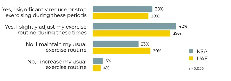 Cultural and religious periods can significantly influence schedules, and exercise routines are often among the first habits to be adjusted. When asked how periods like Ramadan or Christmas affect their gym visits, a notable 30% of people in Saudi Arabia say they “significantly reduce or stop exercising,” compared to 28% in the United Arab Emirates . However, these breaks aren’t universal—42% in Saudi Arabia and 39% in the United Arab Emirates only “slightly adjust” their routines, whilst about a quarter (23% in Saudi Arabia and 29% in the United Arab Emirates) manage to keep their habits consistent. Interestingly, a small but dedicated 5% in Saudi Arabia and 4% in the United Arab Emirates actually increase their workouts during these times—often citing more flexible schedules and a desire to maintain (or accelerate) progress.