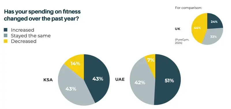 - 43% in KSA and 51% in UAE of participants have increased their fitness spend in the last year, versus just 24% in the UK.