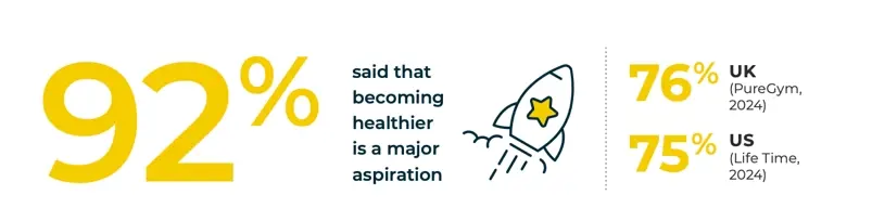 The UK, a mature European-style market, faces different challenges in terms of fitness engagement. PureGym data shows that 65% of Britons feel they are not taking care of their health as much as they should—double the rate found in our Middle Eastern region—while only 76% cite health improvement as a major aspiration (compared to 92% in KSA and the UAE). Though the UK market is large, it is not experiencing the same explosive growth rates observed in the Middle East.
