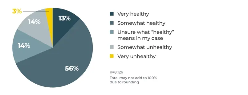 - High Activity Levels: Around 79% of respondents report exercising at least twice a week, and nutrition also fares well, as 69% maintain healthy eating habits.